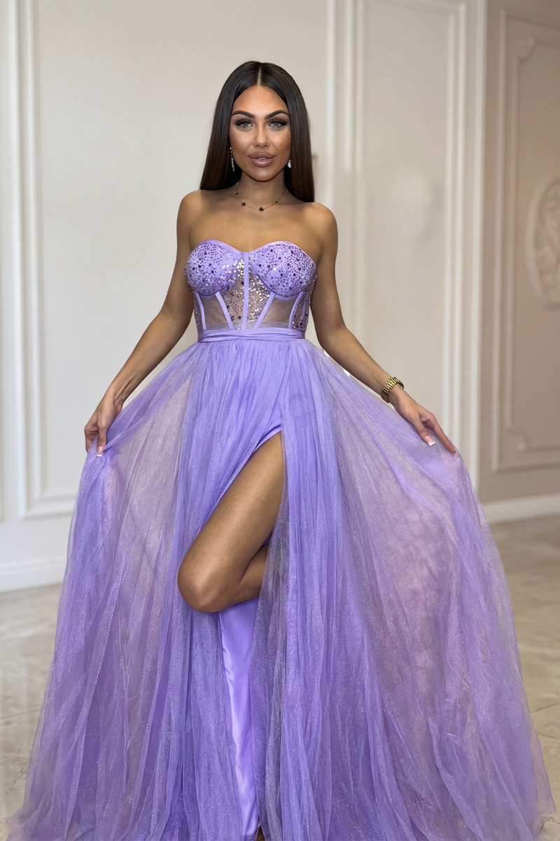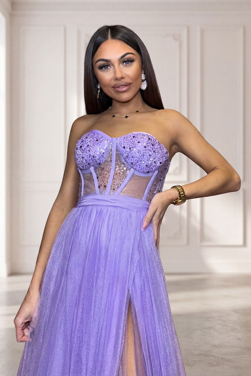 Bella-laventelimekko on todella silmiinpistävä ja romanttinen valinta erityiseen tilaisuuteen. Kimaltelevasta tyllistä valmistettu maksimekko yhdistää naisellisen eleganssin ja modernin glamourin luoden unohtumattoman siluetin, joka kiinnittää huomion joka puolelta. Korsettityylinen yläosa, kauniit paljettiyksityiskohdat ja hienovarainen läpikuultava viimeistely antavat mekolle ylellisen ja juhlavan ilmeen.