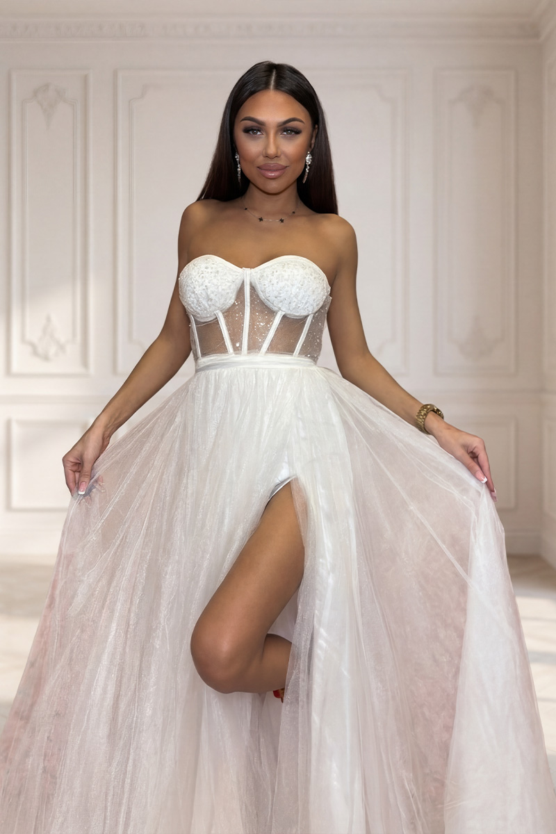 Bella-valkoinen mekko on ylellinen ja romanttinen valinta naiselle, joka haluaa loistaa erityisenä päivänään. Kimalteleva maksimekko yhdistää ilmavan tullin, tyylikkään korsettiyläosan ja naisellisen halkion luoden näyttävän ja ikimuistoisen siluetin. Hienostuneet kimaltelevat yksityiskohdat ja herkkä, läpikuultava yläosa antavat mekolle juhlallisen ja eksklusiivisen ilmeen.