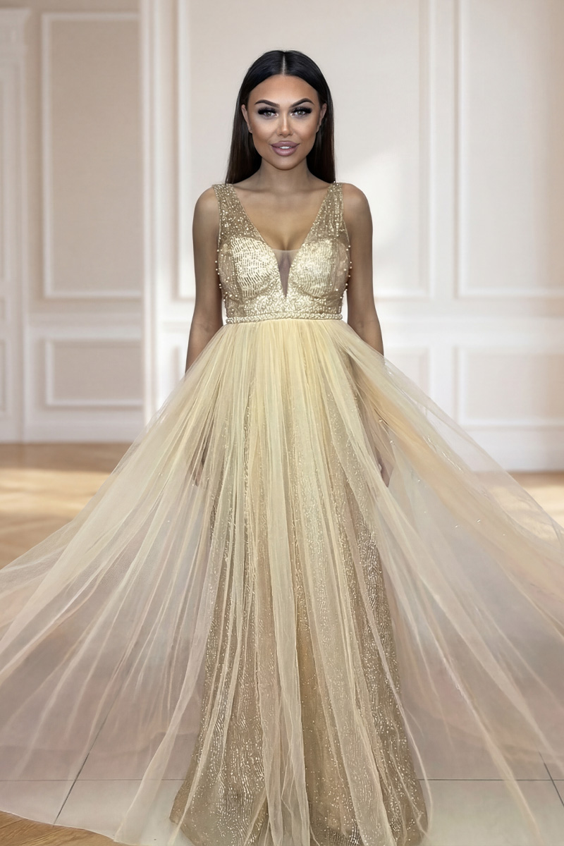 Kultainen Aurora-maksimekko on todella lumoava valinta naiselle, joka haluaa loistaa juhlavassa tilaisuudessa tyylikkäästi ja itsevarmasti. Mekossa yhdistyvät ylellinen hohde, ilmava tylli ja kaunis, valuva siluetti, jotka luovat näyttävän ja mieleenpainuvan kokonaisuuden. Syvä V-pääntie, kimalteleva yläosa ja juhlava maksipituus korostavat naisellisuutta ja lisäävät asuun ripauksen glamouria.