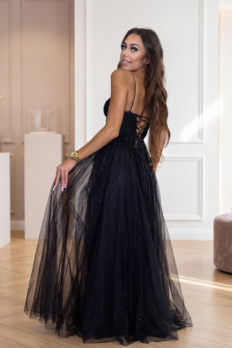 Musta mekko, joka ei jää huomaamatta. Näyttävä korsettiyläosa, kimalteleva tylli ja korkea halkio luovat katseita vangitsevan lookin, jossa yhdistyvät rohkeus, naisellisuus ja ylellisyys. Tämä mekko liikkuu kauniisti ja antaa kantajalleen itsevarman ja säteilevän tunteen.